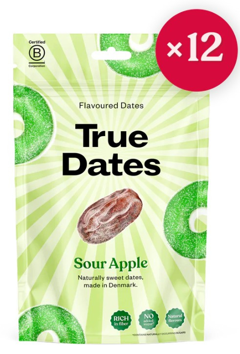 Magozott datolya, savanykás alma ízzel. Összetevők: Datolya (nem EU-s) (92%), cikóriagyökér rost, növényi zsír (kókusz), természetes aroma, sav (almasav). Nyomokban földimogyorót és mandulát tartalmazhat. Száraz, hűvös helyen tárolandó. Felbontás után 14 napon belül fogyasztható.