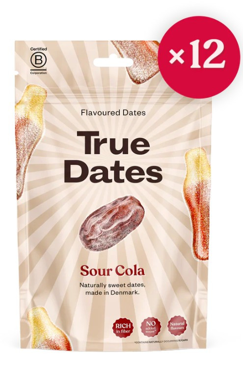 Magozott datolya savanyú kóla ízzel. Összetevők: Datolya (nem EU-s) (93%), cikóriagyökér rost, sav (almasav), növényi zsír (kókusz), természetes aroma. Nyomokban földimogyorót és mandulát tartalmazhat. Száraz, hűvös helyen tárolandó. Felbontás után 14 napon belül fogyasztható.