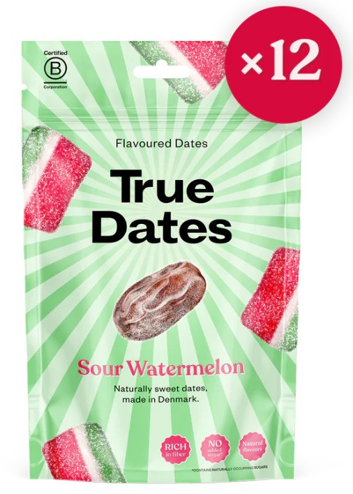 Magozott datolya, savanykás görögdinnye ízzel. Összetevők: Datolya (nem EU-s) (92%), cikóriagyökér rost, növényi zsír (kókusz), természetes aroma, sav (almasav). Nyomokban földimogyorót és mandulát tartalmazhat. Száraz, hűvös helyen tárolandó. Felbontás után 14 napon belül fogyasztható.